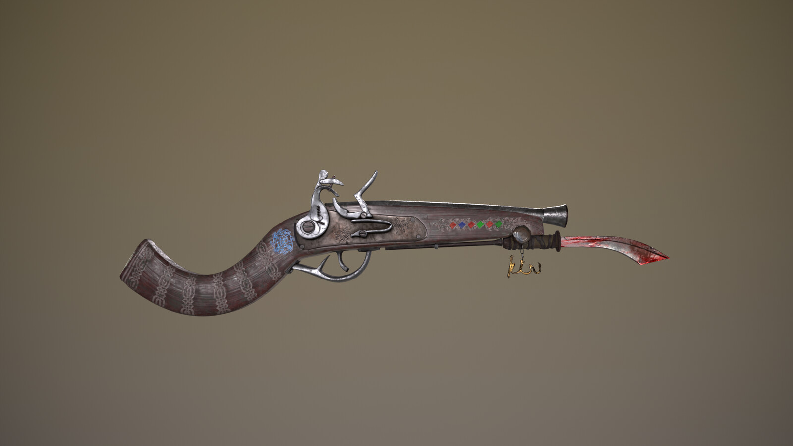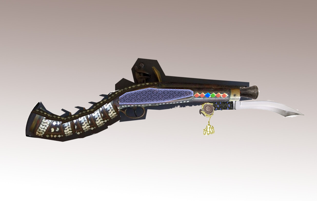 For my Zbrush Hard Surface class we had to create an ornate antique weapon, this prompt was open-ended to allow us to create and have some freeform creativity on what we wanted to do. I was heavily influenced by Islamic art and as such I took inspiration from the Islamic world for patterns and design I took inspiration from Afghan Jezail Flintlocks and European style ones also, combining elements that I liked from both. I also wanted a mysticism element partially inspired by Sufiism and the mythical Djinn or Genie, as such I incorporated Genie lantern-inspired gemstones on it. Which is where I came up with the name. I enjoy both Warhammer and Destiny weapon designs so I took the name as a combination of the genie inspiration and those 2 weapons, which was the Inquisitor. The materials were created in substance painter through texture bashing existing ones and rendered in Marmoset Toolbag 4. The weapon itself was created in Zbrush and the bladed element at the end of it is a Scimitar.
